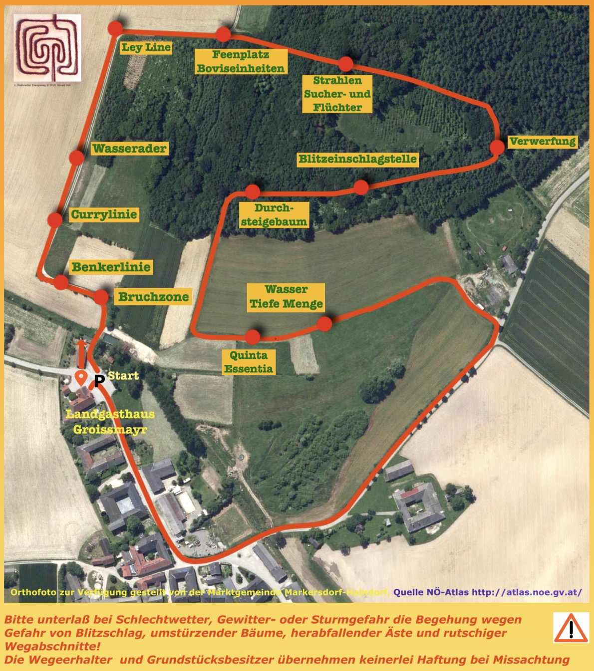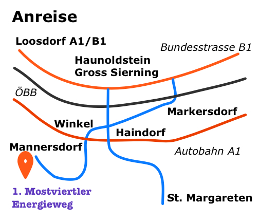 Am Ausgangsort findest du das Landgasthaus Groissmayr mit einem grossen Parkplatz. Es ist der erste "Energieplatz". Der Energieweg befindet sich in der Katastralgemeinde Mannersdorf der Marktgemeinde Markersdorf-Haindorf. Du erreichst uns mit dem Auto: nächste Autobahn Ausfahrt Loosdorf oder von Bundesstrasse B1 in Gross-Sierning Richtung St. Margareten.